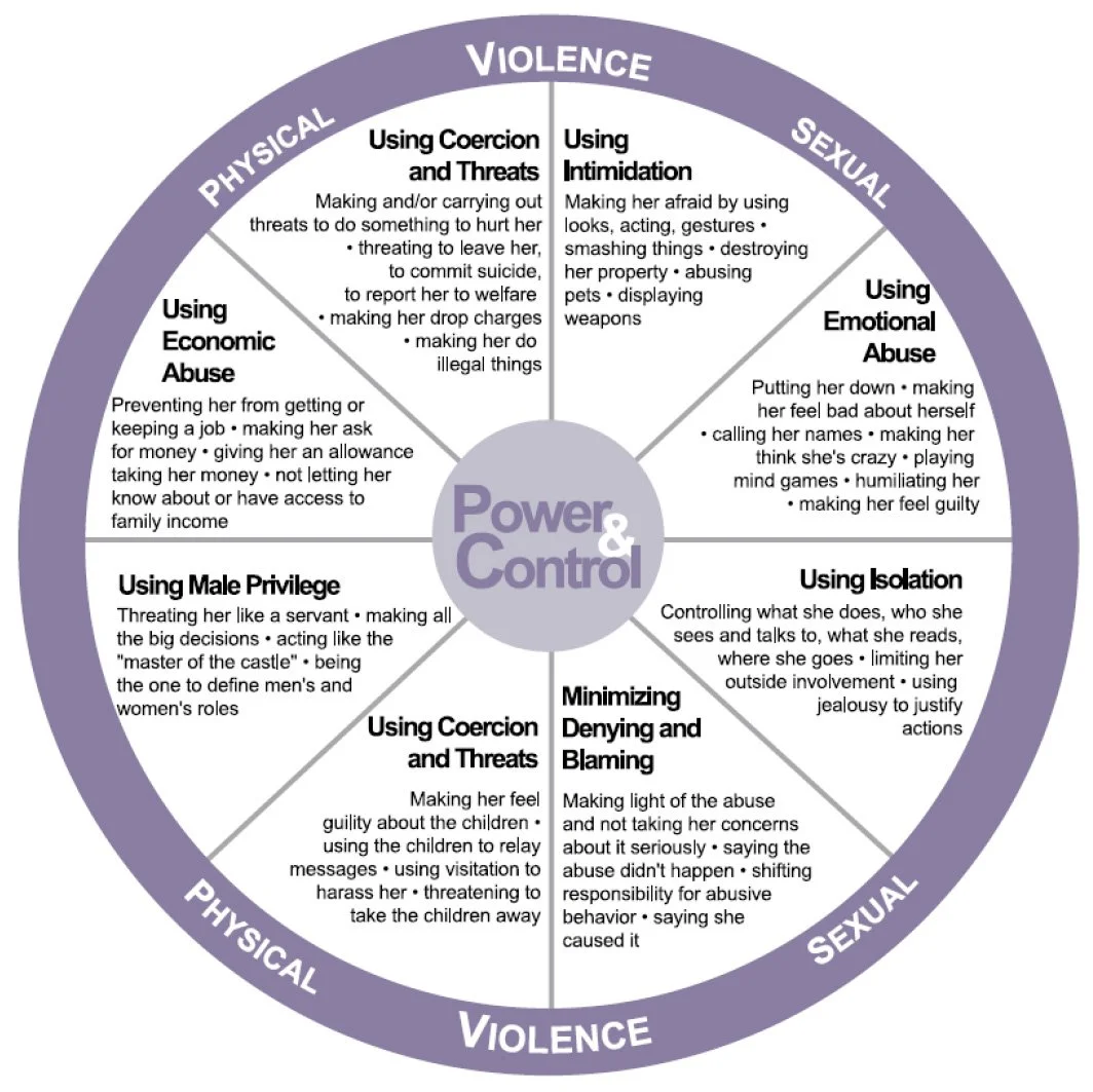 The Power and Control Wheel diagram helps to understand the overall pattern of abusive and violent behaviors, which are used by a batterer to establish and maintain control over his/her victim. The chart below shows the behaviors abusers use to get control in their relationships and keep the control.